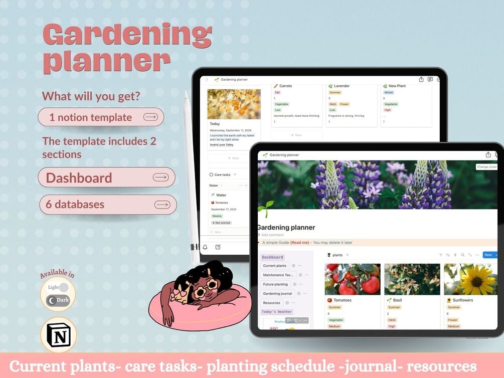 SEO Tags: Gardening planner, Notion template, garden organization, plant care management, planting schedule, gardening journal, garden tracker, improve gardening skills, home gardening solutions.