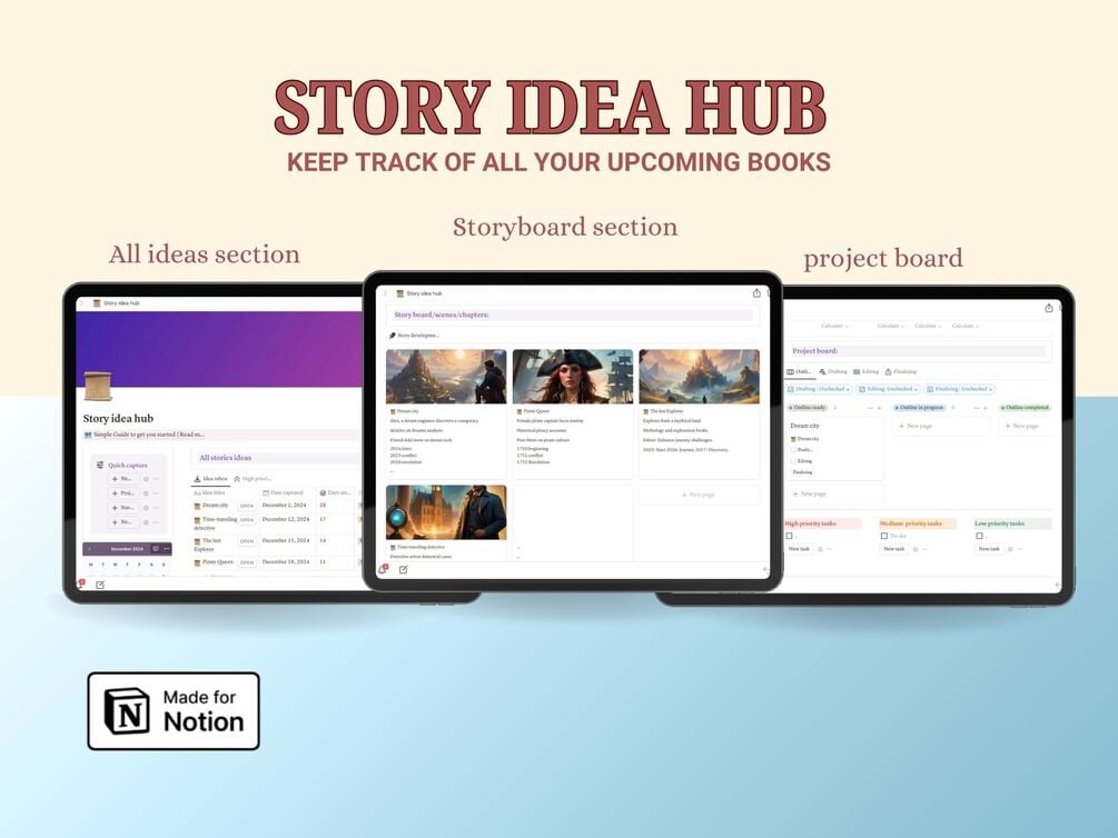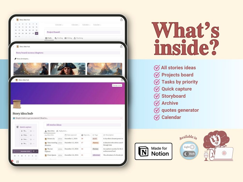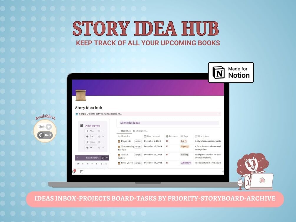When you purchase the Story Idea Hub Template, you'll receive a robust writing tool that includes: