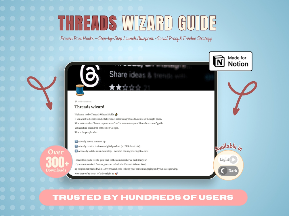 Take it further with the Threads Wizard Tool — a Notion post planner packed with 100+ proven hooks to keep your content engaging and your sales growing.